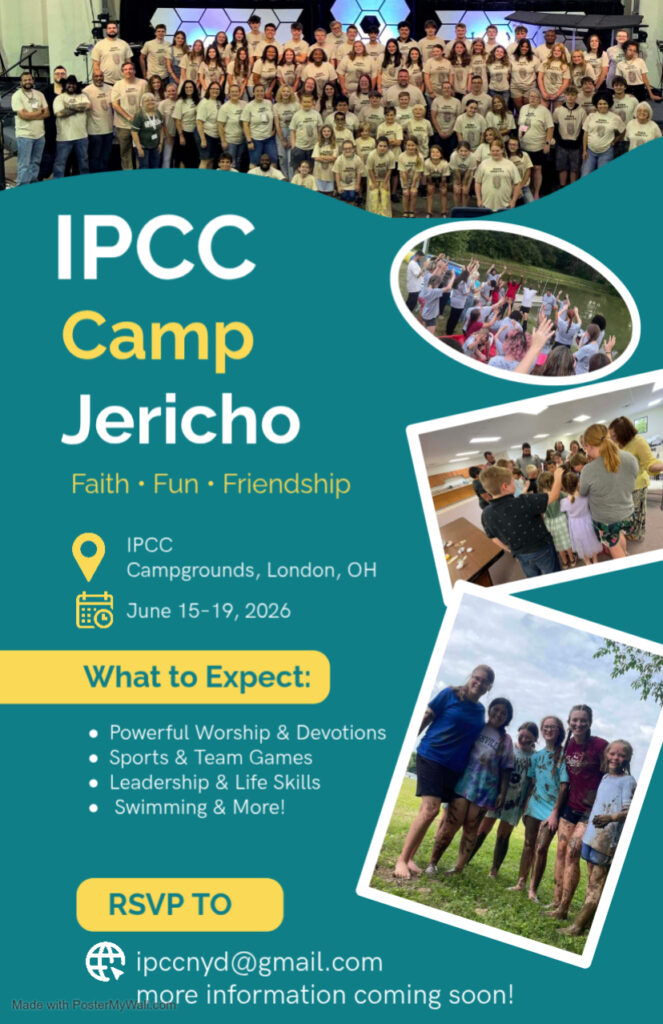The International Pentecostal Church of Christ (IPCC)National Youth Department 2026 YOUTH CAMP For more information send an e-mail to [email protected] Theme: “CAMP JERICHO“For we are his workmanship, created in Christ Jesus unto good works,which God hath before ordained that we should walk in them.Ephesians 2:10 Download the IPCC App, scan the QR code below.